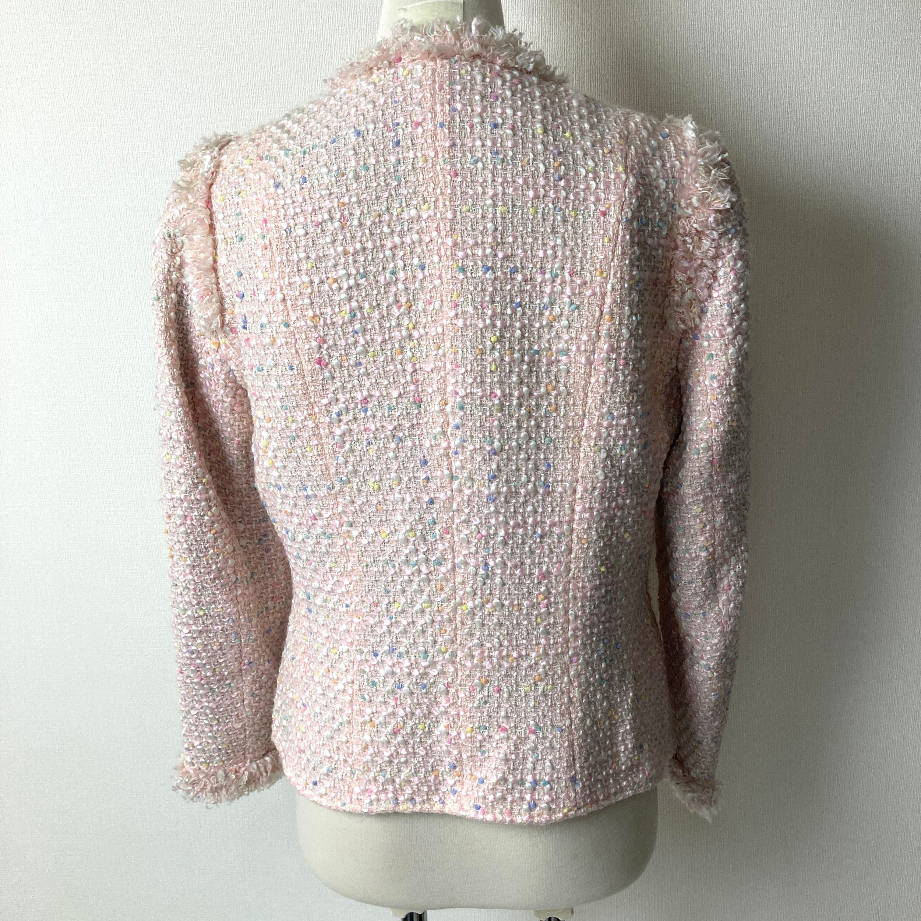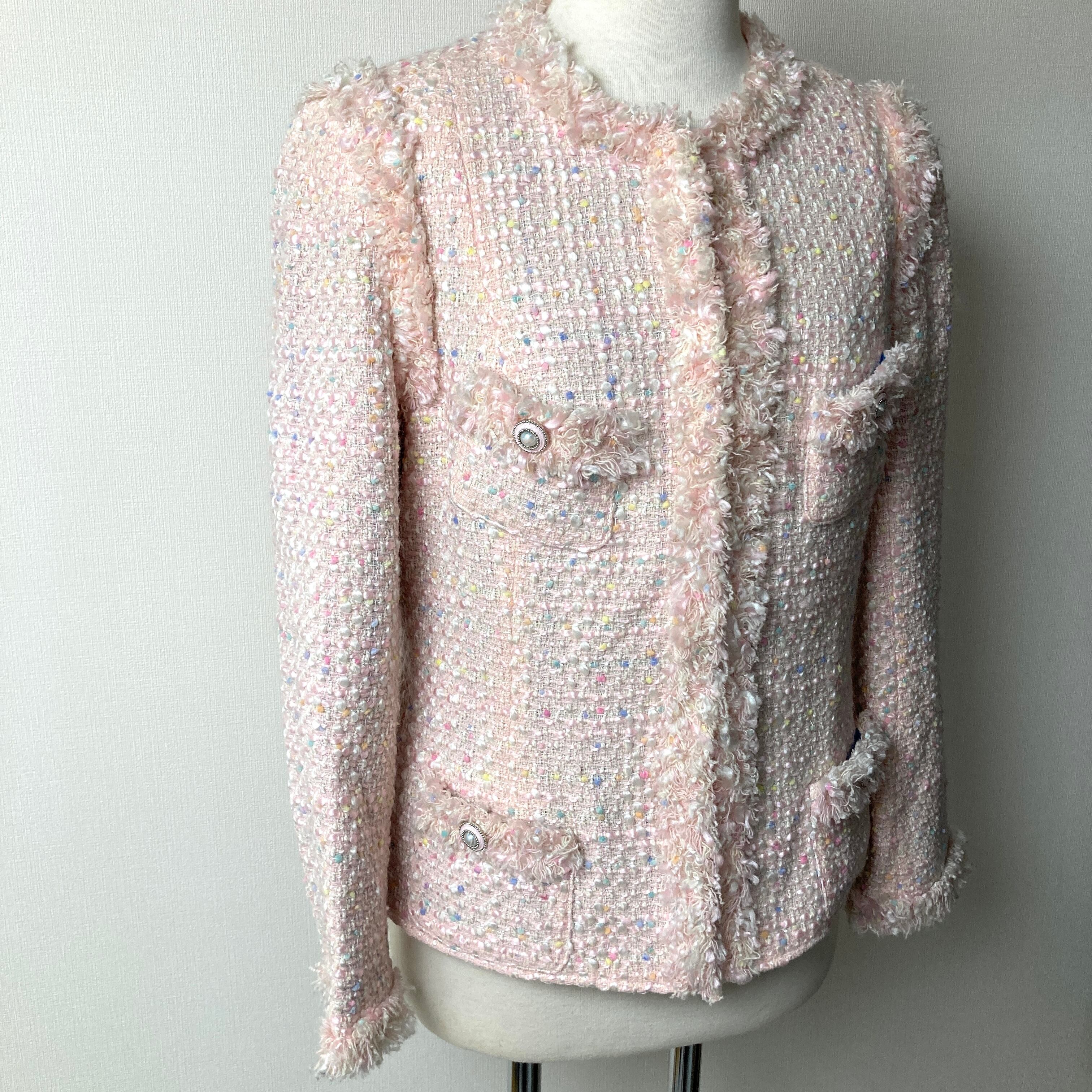 薄い桜のようなピンク色にフェイクパールボタンなどがあしらわれたツイードジャケット