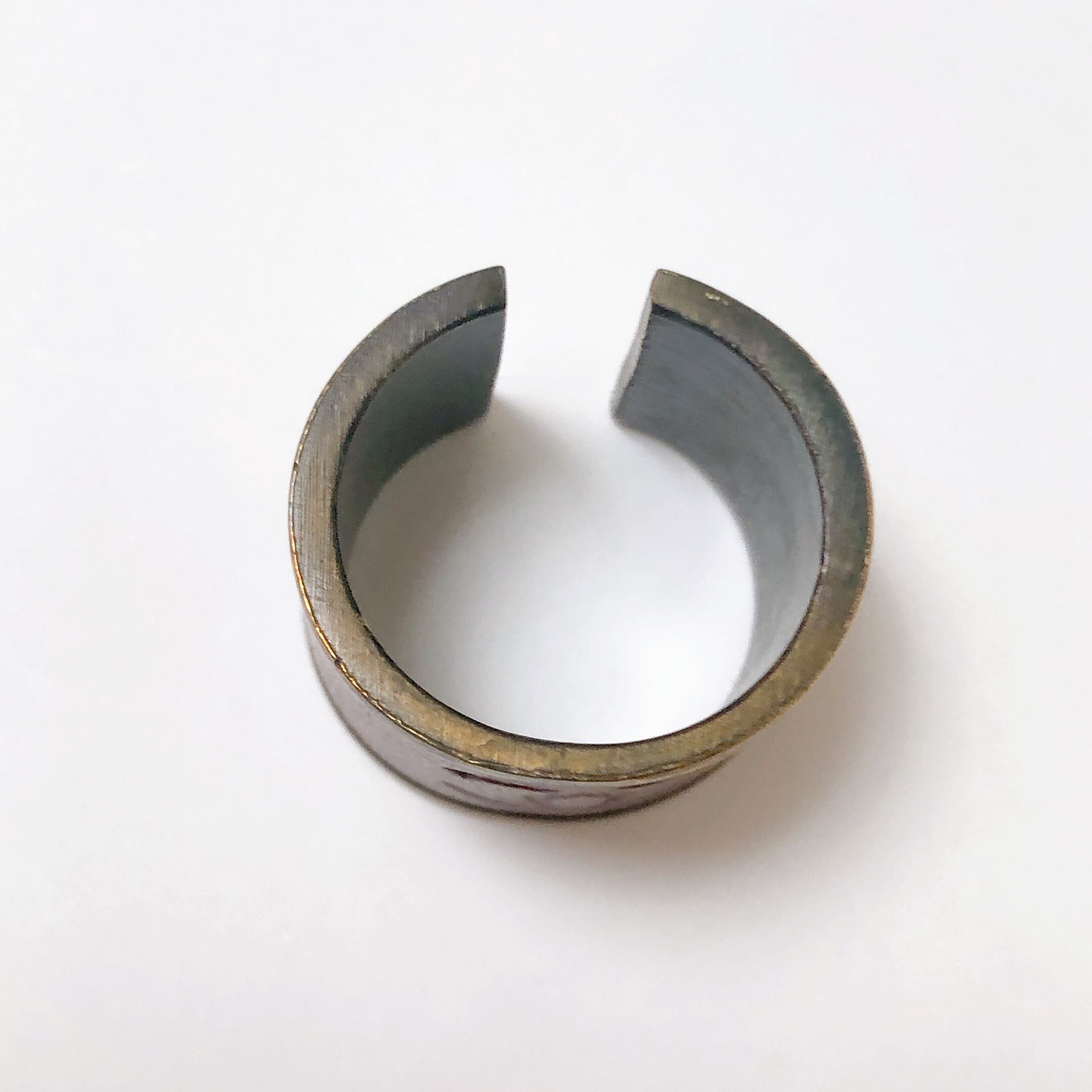 ブロンズのメタルをベースにセンターにココマーク入りのレザーのコンビ。大人めな落ち着いた印象のリングです。