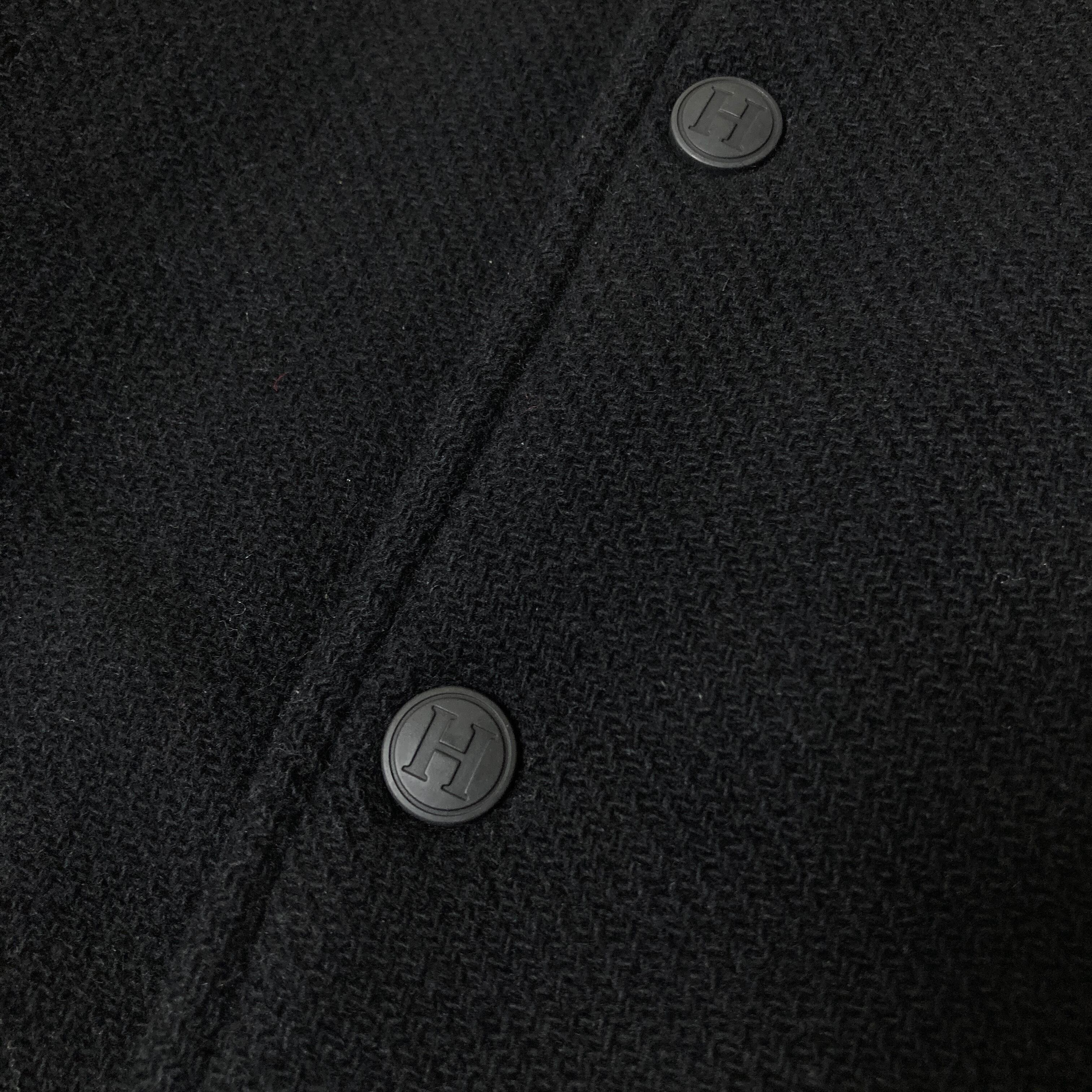 フロントに"H"パッチ、バックに筆記ロゴが入る豪華な仕様で袖も本革使用。スナップボタンにも"H"ロゴ入り。