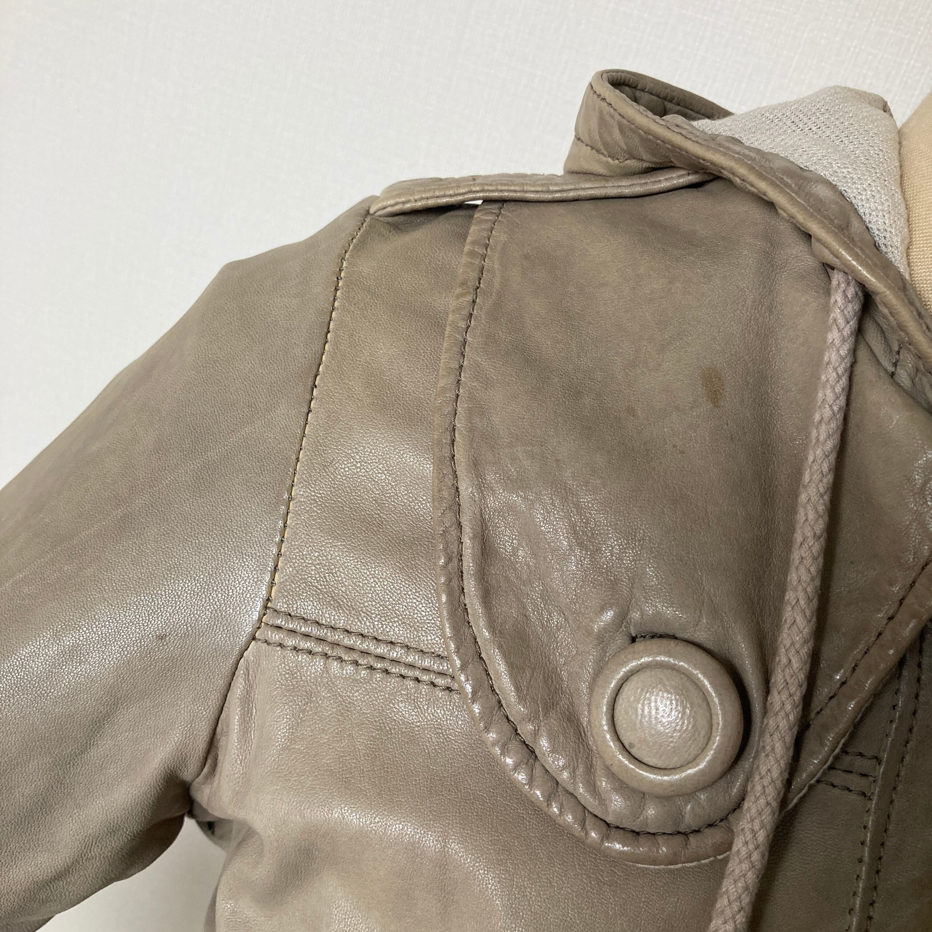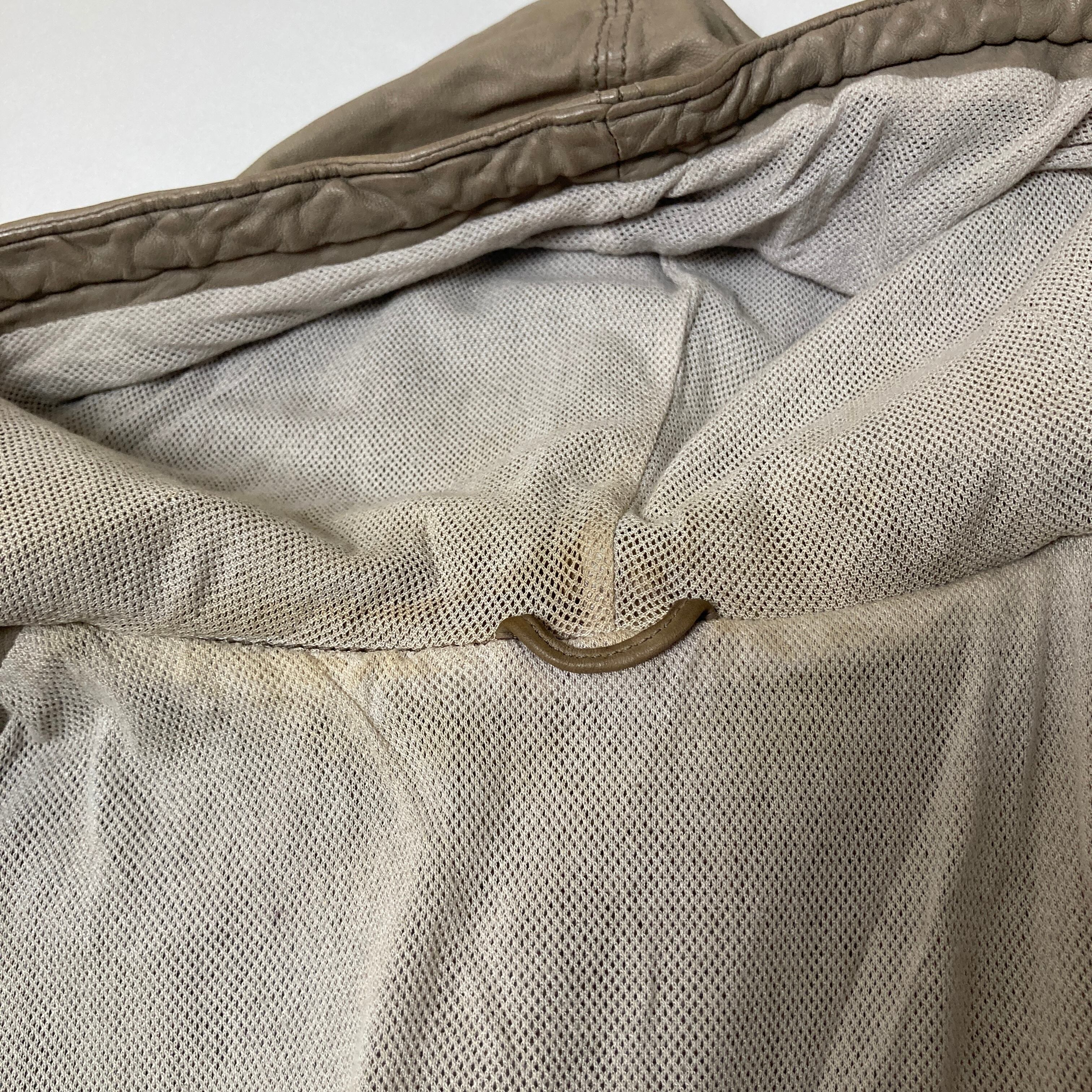 レザーに汚れ、裏地の襟元に汚れが見られます。袖のホツレは元々の加工によるものです。