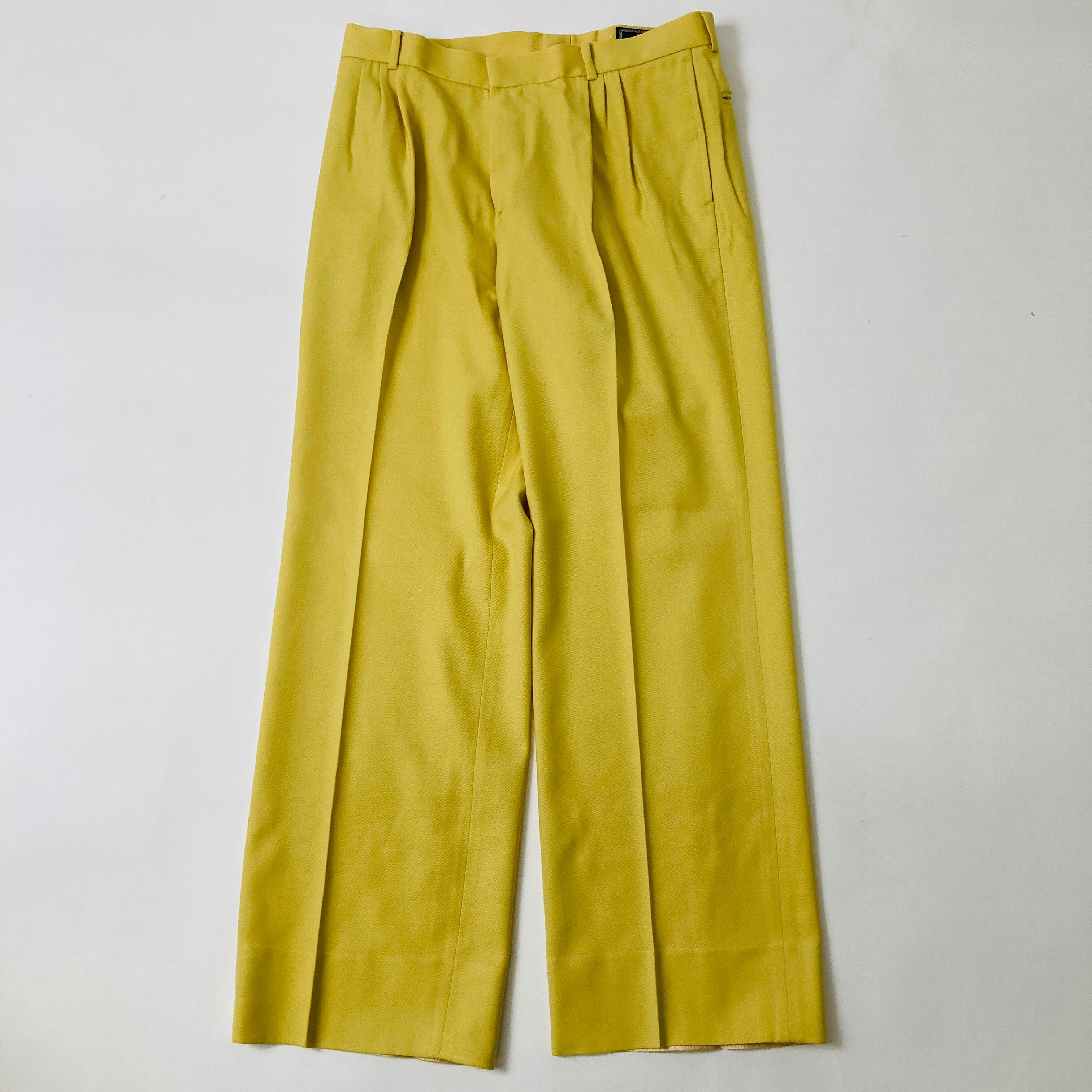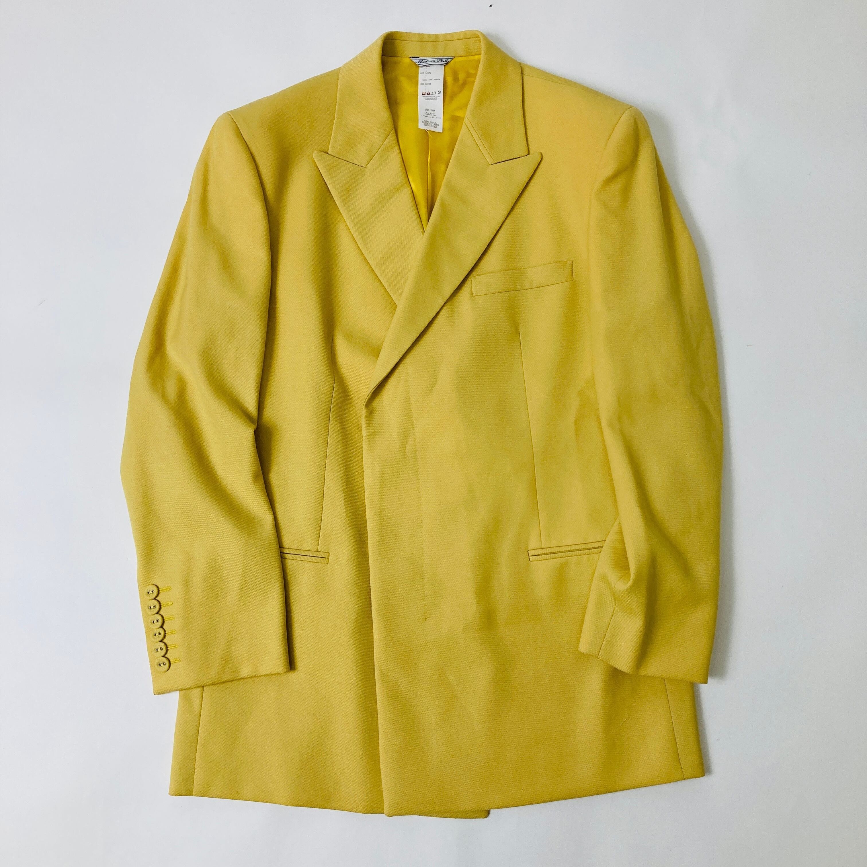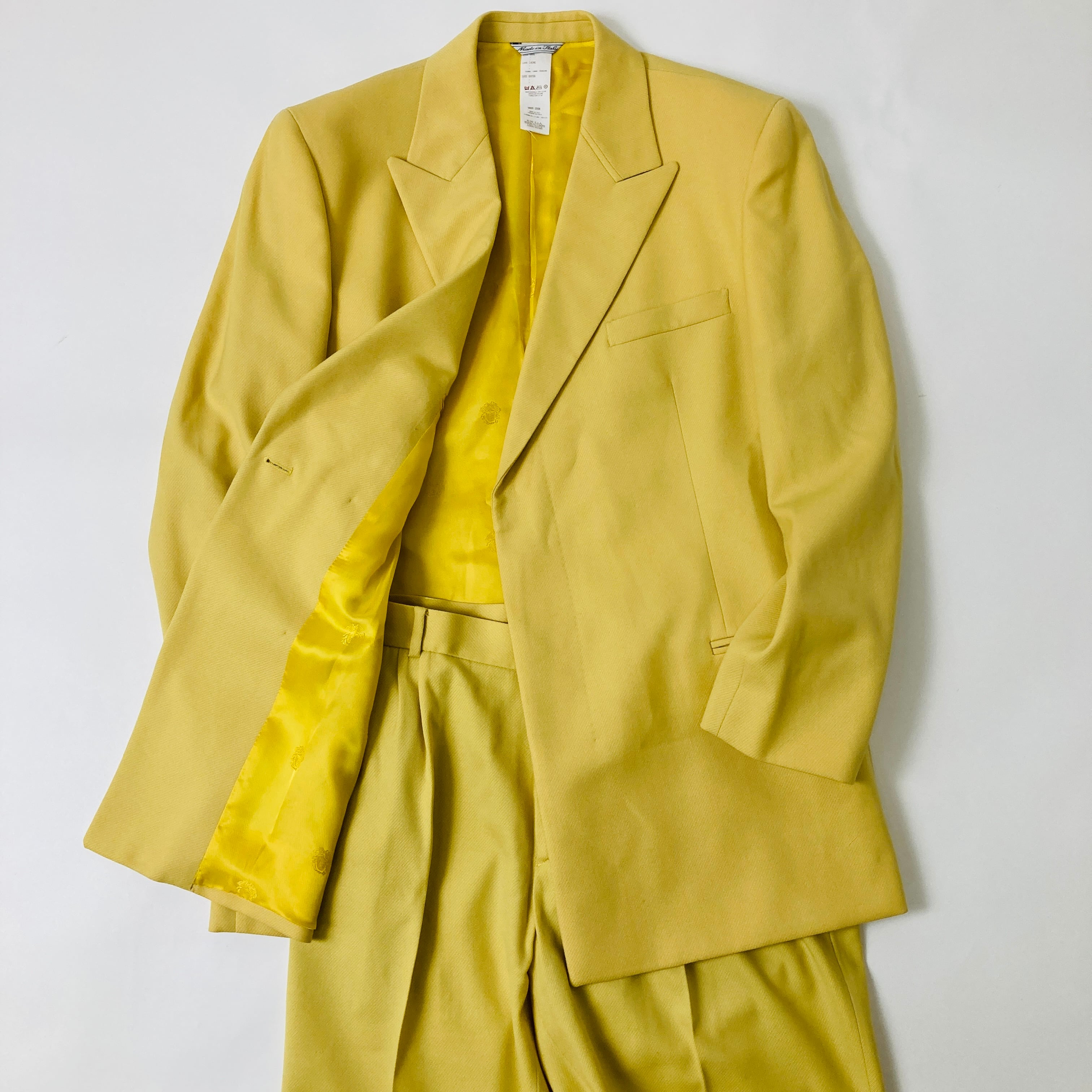 希少なGIANNI VERSACEのカラースーツ。鮮やかなイエローカラー。VERSACEを象徴する美しいスーツです。裏地はメデューサの総ロゴ。テーラードのみやスラックスのみなど、クラシックスタイルとしてのポイントでお使いいただいてもおしゃれです。