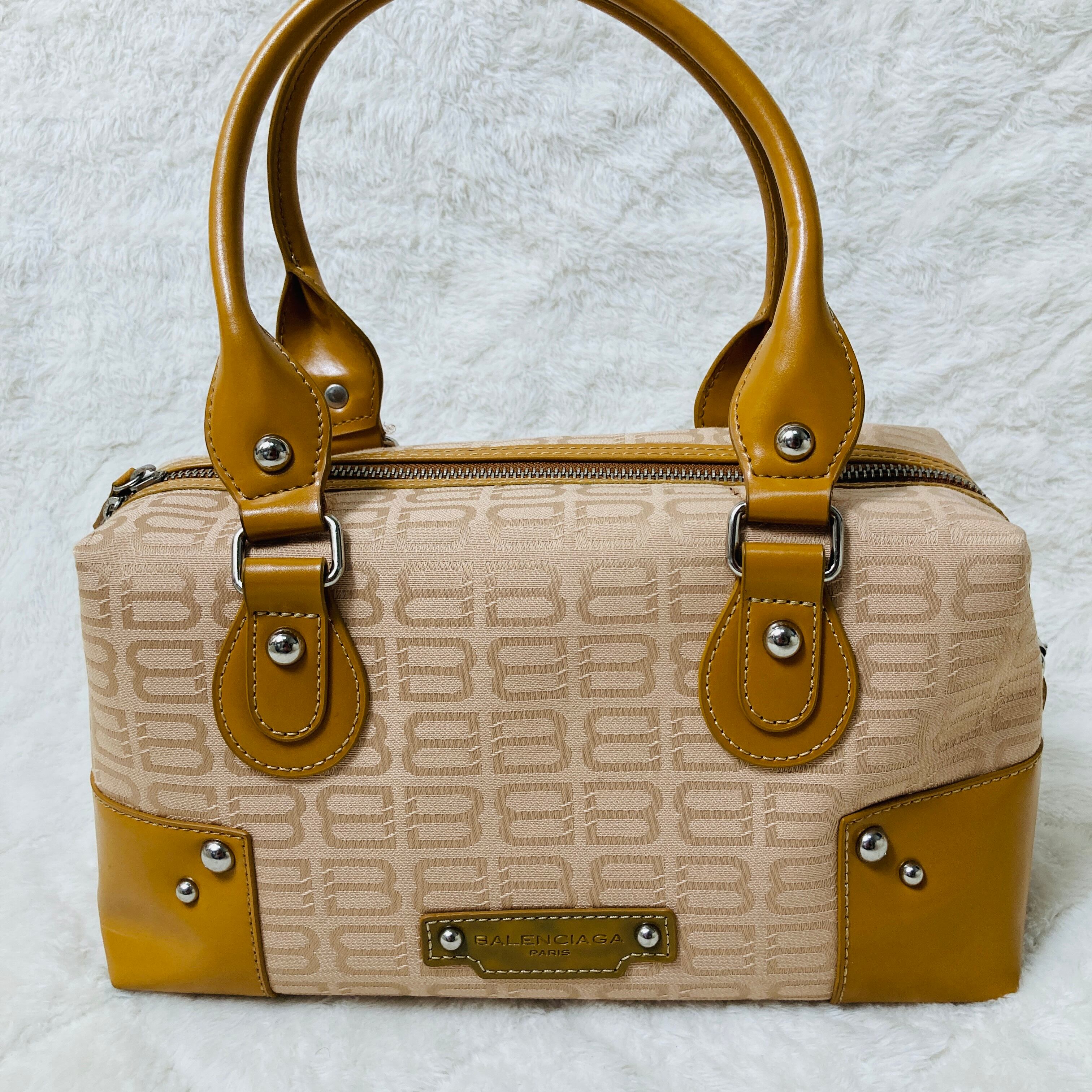 BALENCIAGAの総ロゴキャンバス ハンドバッグです。BBロゴにベージュカラーの上品なデザイン。現在は販売されていないお品物です。