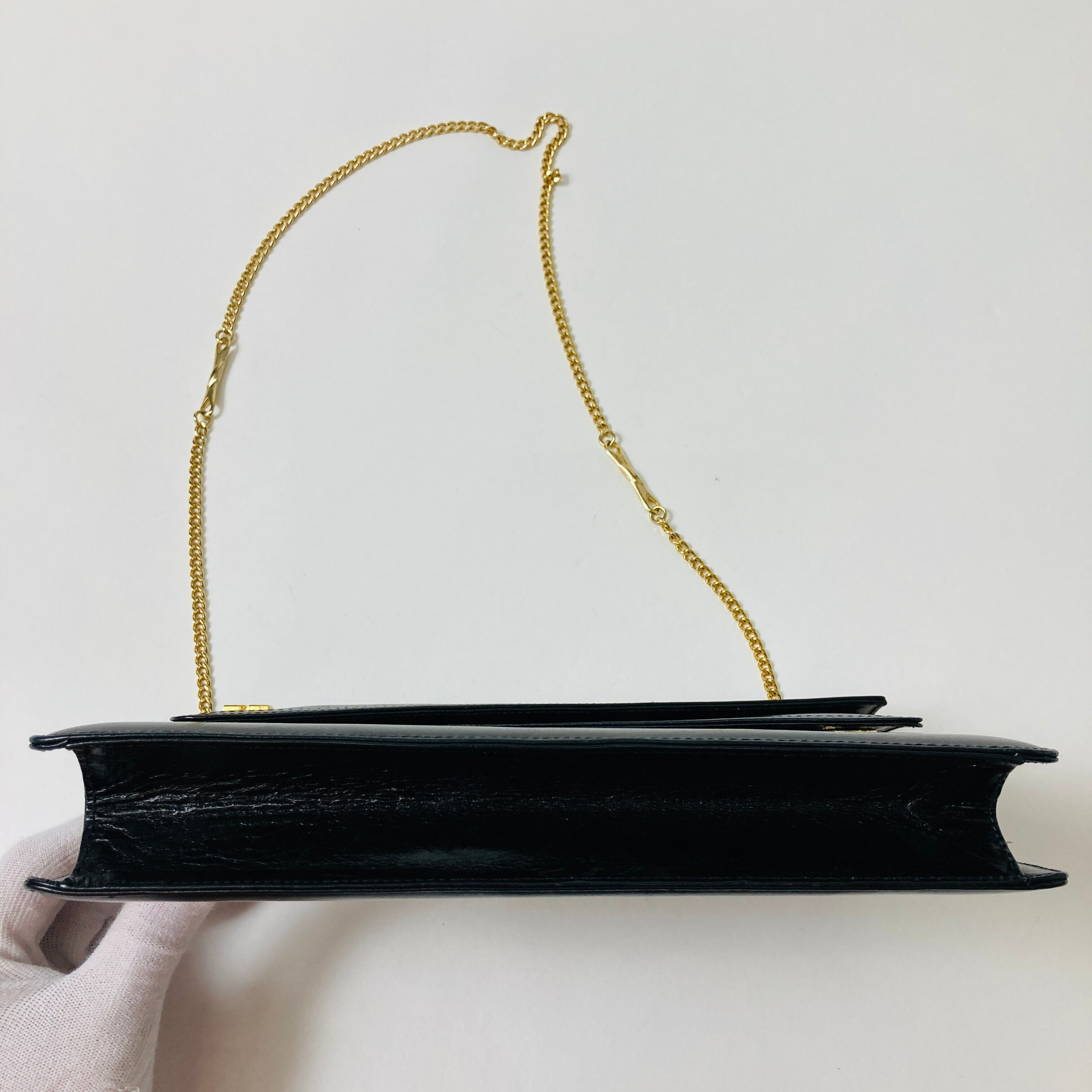 ゴールドのロゴとチェーンがおしゃれなショルダーバッグです。クラシックなデザインでフラップは二重構造です。ヴィンテージがお好きな方におすすめです。