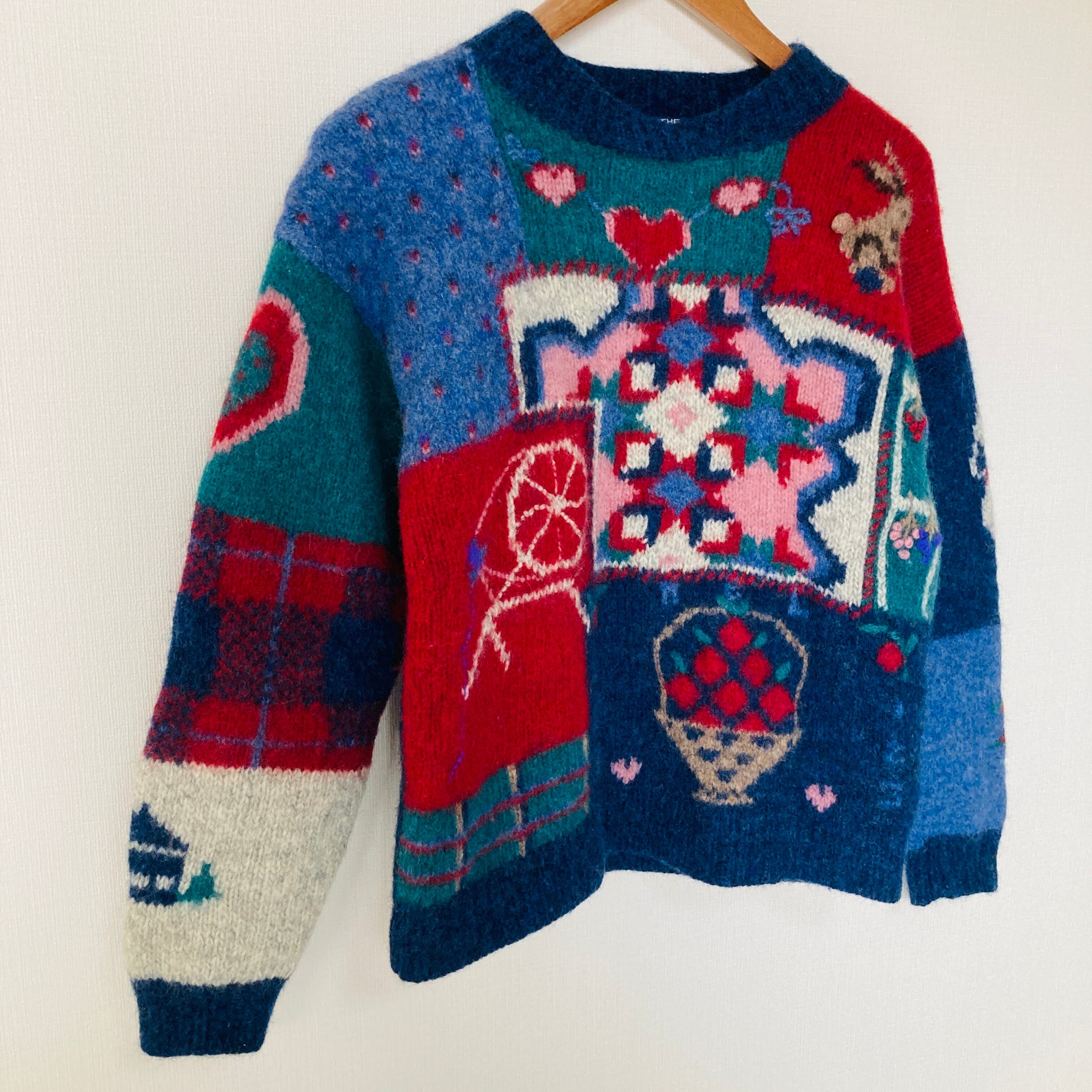 ハートやうさぎなどカラフルで多数の絵柄入りニット。