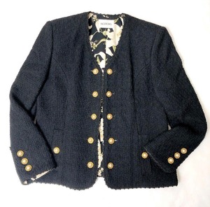 人気のツイードにゴールドとフェイクパールのボタンがおしゃれなノーカラージャケット。